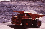 Description :GROS CAMION ORANGE AVEC DES ROUES ENORMES (SIX ROUES) CHARGE D'AMIANTE. A L'ARRIERE-PLAN MINE A CIEL OUVERT.