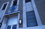 Description :VUE EN CONTRE-PLONGEE DE L'EDIFICE BELL. FENETRES GRILLAGEES. LOGO (CLOCHE) ET INSCRIPTION DE BELL CANADA.