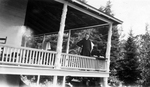 Description :L'ABBE MAURICE O'BREADY, DEBOUT SUR LA GALERIE DU CHALET DES PRETRES DU SEMINAIRE, AU LAC MONTJOIE (AVEC RESERVE)