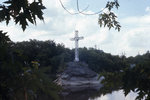 Description :SUR UN GROS ROCHER, AU MILIEU DE L'EAU, EST INSTALLEE UNE IMMENSE CROIX LUMINEUSE. DE NOMBREUX ARBRES TOUT AUTOUR.