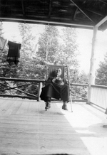 Description :ABBE ROCK POITRAS, DECONTRACTE SUR SA CHAISE DE PARTERRE, AU CHALET DES PRETRES AU LAC MONTJOIE