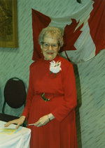 Description :MARGUERITE MORISSET TENANT UN CRAYON DANS SA MAIN GAUCHE. EN ARRIERE-PLAN, UN DRAPEAU DU CANADA EST ACCROCHE AU MUR