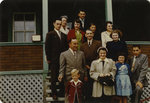 Description :MARGUERITE MORISSET - LECLAIRE ET PLUSIEURS MEMBRES DE SA TROUPE DE THEATRE POSENT SUR LES MARCHES D'UN PERRON. PARMI CES GENS, ON RETROUVE MARGUERITE MORISSET - LECLAIRE, MICHELINE LECLAIRE, GILLES MARTEL, GERARD BUREAU, HUGUETTE LECLAIRE, RI...