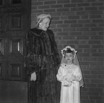 Description :MME MORISSET EST DEBOUT, VETUE D'UN MANTEAU DE FOURRURE ET D'UN BONNET. A COTE, UNE DE SES ELEVES HABILLEE D'UNE ROBE BLANCHE, D'UN DIADEME ET D'UN VOILE DE PREMIERECOMMUNIANTE.