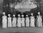 Description :8 FILLETTES HABILLEES EN BERGERES ET SE TENANT LA MAIN SOURIENT A LA CAMERA.