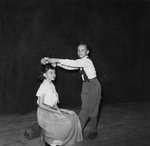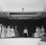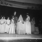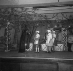 Description :ON VOIT HANSEL (GAETAN DOSTIE), DEBOUT, QUI POSE UNE COURONNE DE FLEURS SUR LA TETE DE GRETEL (DENISE DUFORD) QUI, ELLE, EST ASSISE SUR UNE BUCHE. HANSEL REGARDE LA CAMERA.