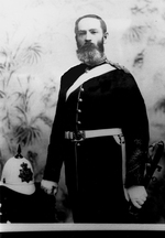 Description :PLAN MOYEN DU LT. COL. W.A. MOREHOUSE EN HABIT MILITAIRE. SON CASQUE BLANC DECORE DE L'ARMOIRIE DU 53e BATAILLON EST DEPOSE SUR UNE PETITE TABLE A COTE DE LUI SUR LAQUELLE IL S'APPUIE DE LA MAIN DROITE, DANS SA MAIN IL TIENT UNE EPEE.