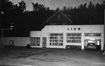Description :FACADE COMPLETE DU GARAGE ET POMPE A ESSENCE. ETALAGE DE BOITE D'HUILE, PNEUS GOODRICH SUR LE TOIT. INSCRIPTION LION GASOLINE STATION.