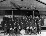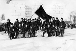 Description :LES MEMBRES DU CLUB POSENT DEVANT UN CHATEAU DE GLACE LORS DU CONGRES INTERNATIONAL DE LEWISTON, MAINE (E.U.). LE GARCON SUR LA GROSSE CAISSE EST YVAN TRUDEAU.