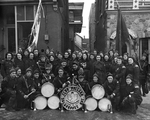 Description :LES MEMBRES DU CLUB POSENT A L'ISSUE D'UNE PARADE POUR ASSISTER A LA MESSE. LA FEMME ORNEE DE MEDAILLES EST JEANNINE LESSARD. LA PHOTO EST PRISE DEVANT L'HOTEL UNION AU 285 KING OUEST.
