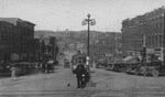 Description :UN POLICIER, DEBOUT DEVANT UN REVERBERE ET UN TRAMWAY PREND LA POSE. ON APERCOIT L'ENFILADE DES COMMERCES DE CHAQUE COTE DE LA RUE ET DES VOITURES STATIONNEES DEVANT CES COMMERCES.
