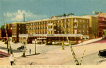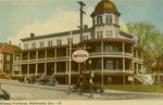 Description :FACADE RECTANGULAIRE DE L'HOTEL SUR LA RUE DEPOT. UNE GALERIE DE METAL EST SUPPORTEE PAR DES PILASTRES DE BETON. LES FENETRES SONT EN OGIVES SANS VOLET. LE TOIT EST ORNE A CHAQUE COIN DE DRAPEAUX.