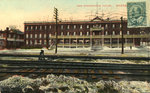 Description :EN AVANT-PLAN, LES RAILS DE CHEMIN DE FER AVEC LEVIER DE CROISEMENT MANUEL. DERRIERE, L'HOTEL NEW SHERBROOKE, EDIFICE DE BRIQUES LONGITUDINAL DONNANT SUR LA RUE DEPOT, TRES BIEN DECORE. A GAUCHE, LA SILVER SPRING BREWERY.