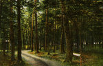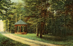 Description :A GAUCHE, SENTIER SE DIRIGEANT DANS LE BOISE. A COTE, LE PETIT PAVILLON AVEC TOIT EN DOME EST RECOUVERT DE BARDEAUX D'ASPHALTE ET SA STRUCTURE EN BOIS EST RICHEMENT ORNEE.