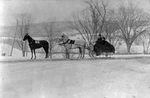 Description :UN COUPLE NON IDENTIFIE DANS UNE CARRIOLE TIREE PAR TROIS CHEVAUX EN PROMENADE. PAYSAGE CHAMPETRE.