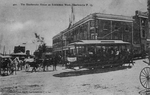 Description :LA PHOTO EST PRISE A L'ANGLE KING - DEPOT, NOUS MONTRANT LE SHERBROOKE HOUSE AVEC SES COLONNES ET SES VERANDAS. DEVANT L'HOTEL, IL Y A UNE AFFLUENCE DE CHEVAUX ET DE CHARETTES ET UN TRAMWAY BONDE PORTE UNE BANDEROLE "EXHIBITION GATE". DERRIERE...