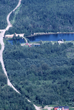 Description :VUE AERIENNE DU MONT ST-JOSEPH, PRES DU MONT-MEGANTIC. UNE ROUTE TRAVERSE LES FORETS.