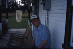 Description :BERNARD EPPS VERS L'AGE DE 65 ANS ASSIS, PROBABLEMENT SUR LA VERANDA DE SA RESIDENCE. 1.1: IL PORTE UNE CASQUETTE. 1.2: SANS CASQUETTE, IL POSE AVEC UN CHIEN A COTE DE LUI.