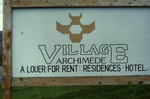 Description :INCRIPTIONS "VILLAGE ARCHIMEDE, A LOUER/ FOR RENT: RESIDENCE/ HOTELS" SUR UN PANNEAU BLANC AVEC LOGO.