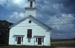 Description :PETITE EGLISE BLANCHE EN BOIS, VUE A CONTRE-JOUR.