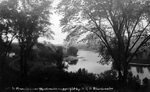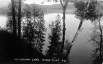 Description :LE LAC MASSAWIPPI VU A TRAVERS QUELQUES ARBRES. AU LOIN, UN CHALET.