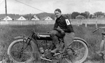 Description :JIM MCCREA PREND UNE PAUSE A COTE DES TERRAINS DE L'EXPOSITION AGRICOLE. IL PORTE UN BROSSARD EPINGLE SUR LA MANCHE CAR IL A PARTICIPE A UNE COMPETITION. SA MOTO EST UNE INDIAN. A L'ARRIERE-PLAN, LES ECURIES DE L'EXPOS.