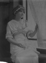 Description :JEUNE FEMME EN ROBE DE MARIEE AVEC COURONNE DE FLEURS AUTOUR DES CHEVEUX RELEVES ET PETIT BOUQUET A LA MAIN. ELLE REGARDE A LA FENETRE DE LA RESIDENCE MCCREA, TOUT EN ECARTANT LE RIDEAU.