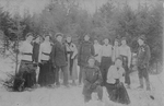 Description :13 JEUNES GENS EN RAQUETTES SUR LE BORD D'UN BOIS.