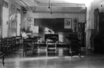 Description :SALLE DE CLASSE VUE DE L'ARRIERE. UNE VINGTAINE DE PUPITRES, DIVERSES ILLUSTRATIONS D'ANATOMIE, SQUELETTE, ETC.