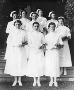 Description :NEUF INFIRMIERES EN UNIFORME POSENT SUR TROIS RANGS. ELLES PORTENT UN PETIT BOUQUET DE FLEURS AU POIGNET. PHOTO EXTERIEURE DANS LES ESCALIERS.
