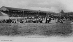 Description :LA GRANDE ESTRADE EST REMPLIE DE SPECTATEURS. UN KIOSQUE AU FOND. EN ARRIERE-PLAN, QUELQUES TENTES. DES SPECTATEURS SE PROMENENT, D'AUTRES SONT ASSIS SUR LE GAZON.