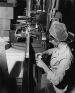 Description :3.1: EMBALLAGE DE CHERRY BLOSSOM A LA LOWNEY'S. JEUNE FEMME, PORTANT RESILLE ET SARRAU, EN TRAIN DE METTRE EN BOITE PLUSIEURS BOITES DE CHOCOLAT. 3.2: FABRICATION DE SEMELLES DE CAOUTCHOUC A L'AMERICAN BILTRITE. 3.3: GANTERIE AUSTIN GLOVE M...