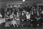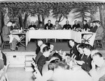 Description :SUR L'ESTRADE DE LA SALLE DE L'ECOLE ST-JEAN-BAPTISTE, UNE TABLE EN ®U¯ EST INSTALLEE. ON Y RECONNAIT: ? , ? , HENRI-PAUL LEMIEUX, LE CURE DOLORE BIRON, ? , ANTONIO BEGIN, ? , ? , ? , J.EMILE CAMBRON, ANTONIO MONTOUR, EUGENE LALIBERTE...