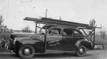 Description :VOITURE DE ANTONIO MONTOUR, DE MARQUE DODGE 1940, LORS DU TRANSPORT D'UNE ENSEIGNE.