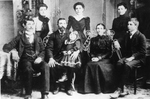 Description :COUPLE D'CA 50 ANS ASSIS. L'HOMME TIENT UNE FILLETTE D'CA 5 ANS. A GAUCHE, UN JEUNE HOMME ET A DROITE EN ADOLESCENT, TOUS DEUX ASSIS. AU DEUXIEME RANG, DEBOUT: TROIS JEUNES FEMMES.