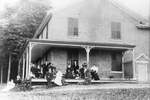 Description :FAMILLE BECKETT SUR LA VERANDA DE LA MAISON ®THE WILLOWS¯. GROSSE MAISON DE STYLE NATIONAL A DEUX ETAGES EN BRIQUES, PIGNON LATERAL, VERANDA SUR DEUX COTES AU PREMIER ETAGE, VOLETS FERMES. SEIZE PERSONNES DE TOUS AGES EN TENUE ESTIVALE DAN...