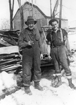 Description :FRANK GEORGE BECKETT VERS L'AGE DE 70 ANS AVEC CECIL LEECH (PEUT-ETRE UN EMPLOYE). ILS SONT TOUS DEUX DEHORS, DEBOUT EN HABIT DE TRAVAIL, CIGARE A LA MAIN, PRES D'UNE GRANGE. SUR LES TERRAINS DE LA FERME BECKETT ENNEIGES.