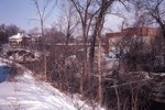 Description :A PARTIR DE LA RUE MAGOG, VUE SUR LA RIVIERE MAGOG ET DESCENDANT, DANS LE TOURNANT, AVANT LE PONT CABANA. A L'AVANT PLAN, PLUSIEURS ARBRES DENUDES. EN ARRIERE PLAN, SUR LA GAUCHE, RESIDENCE DE BRIQUES SUR LE BORD DU PONT. A DROITE, EDIFICE ...