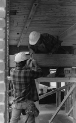 Description :DES OUVRIERS S'AFFAIRENT A POSER POUTRES ET CHARPENTES A L'INTERIEUR DE L'ANCIENNE USINE PATON.