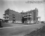 Description :VUE DE BIAIS DE L'HOPITAL ST-VINCENT-DE-PAUL. 4 ETAGES EN BRIQUES. PORCHE DE L'ENTREE PRINCIPALE A 6 COLONNES. ROTONDE, GALERIES ET BALUSTRADES.