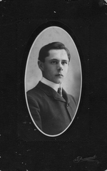 Description :VUE DE BIAIS DE LA RESIDENCE DE BRIQUES AVEC PIGNON CENTRAL. A GAUCHE, CHEMIN DE PIERRES, A DROITE VUE PARTIELLE DE LA MAISON VOISINE. SUR LES MARCHES DE L'ENTREE PRINCIPALE, LEONIDAS BACHAND SE TIENT DEBOUT.