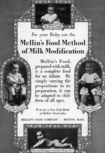 Description :FEUILLET VANTANT LA MELLIN'S FOOD METHOD OF MILK MODIFICATION, SUR LEQUEL LA PHOTO DE GUY BACHAND SUR SON VEHICULE DE BOIS EST IMPRIMEE. CETTE PHOTO, DE MEME QUE CELLE DE TROIS AUTRES ENFANTS, ENTOURENT UN TEXTE PUBLICITAIRE DE MELLIN'S FOOD M...