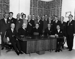 Description :DERRIERE UN BUREAU, PRENNENT PLACE SUR DEUX RANGEES LES CONVIVES. ASSIS: LES DIGNITAIRES DONT UN ECCLESIASTIQUE EN PLEIN CENTRE. DEBOUT, LES SOCIETAIRES LEONIDAS BACHAND EST LE CINQUIEME A PARTIR DE LA GAUCHE.