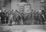 Description :GROUPE D'HOMMES EN COMPAGNIE DU CURE PLAMONDON SUR LE PARVIS D'UNE EGLISE. CEUX-CI PORTENT MEDAILLES ET ETENDARD ET FONT PARTIE DU GROUPE: LES ARTISANS D'EAST ANGUS.