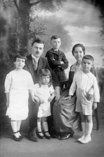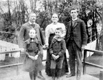Description :DEBOUT, SUR UNE GALERIE, LES EPOUX LEONILDE-CHARLES ET GEORGINE ET TROIS DE LEUR QUATRE ENFANTS: JOSEPH-DEVONVILLE, 15 ANS, A L'ARRIERE. A L'AVANT, BERNADETTE ARCHAMBAULT ET LEONIDAS, SIX ANS. DERRIERE LE GROUPE, DES CORDES A LINGE COUVERTES D...