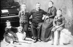 Description :LES EPOUX GEORGINE ET LEONILDE-CHARLES AU CENTRE. A GAUCHE LEONIDAS, 3 ANS, ASSIS SUR UN CHIEN DANOIS. CHARLES-EMILE, 10 ANS, EST DEBOUT DEVANT L'HARMONIUM. JOSEPH-DEVONVILLE, 12 ANS, EST ASSIS SUR UN BANC RECOUVERT D'UNE FOURRURE.