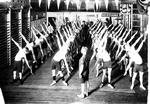 Description :42 JEUNES HOMMES, TORSE NU, FONT DES ETIREMENTS PENCHES SUR UNE HANCHE. UN MONITEUR LES DIRIGE A L'AVANT TANDIS QUE SEPT HOMMES EN COMPLET LES REGARDENT DU FOND DU GYMNASE. APPAREILS D'EXERCISE AUTOUR DE LA SALLE. GUIRLANDES ET FANIONS AU PLAF...