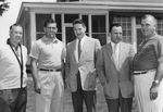 Description :IVAN DUGRE, MAURICE RICHARD, DR. GOSSELIN, JULES ARTHUR ST-ONGE ET RAYMOND LABONTE PHOTOGRAPHIES DEBOUT EN PLEIN AIR. A L'ARRIERE PLAN ON APERCOIT LE CHALET DU SHERBROOKE COUNTRY CLUB.