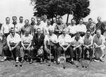 Description :PHOTO DE GROUPE, PRISE DEVANT LES GARAGES DE L'ENTREPOT DE LA NATIONAL BREWERIES, RUE WELLINGTON SUD. PUBLICITES DE BIERES A L'ARRIERE-PLAN. LES JOUEURS SONT DISPOSES SUR DEUX LIGNES. AU PREMIER RANG: R. BREAULT, F. KIRBY, IVAN BOISVERT, O. GA...