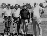Description :"RED" GASTON ROY, YVON ELLYSON, IVAN BOISVERT ET MARCEL SEVIGNY DEBOUT BATON DE GOLF EN MAINS SUR UN TERRAIN DE GOLF.